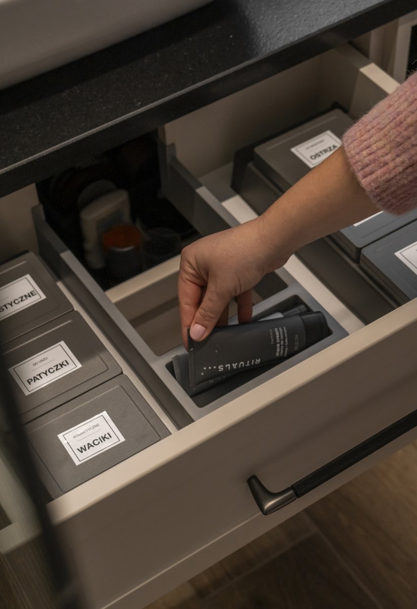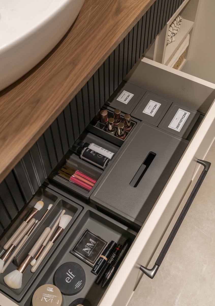 Wkład do szuflady umywalkowej od Peka rozwiązuje ten problem – specjalnie wyprofilowany wkład omija syfon, a jednocześnie dzieli przestrzeń na wygodne przegródki.