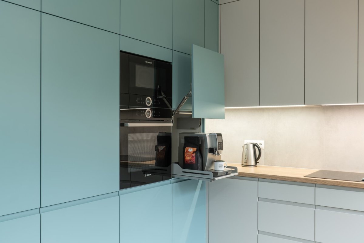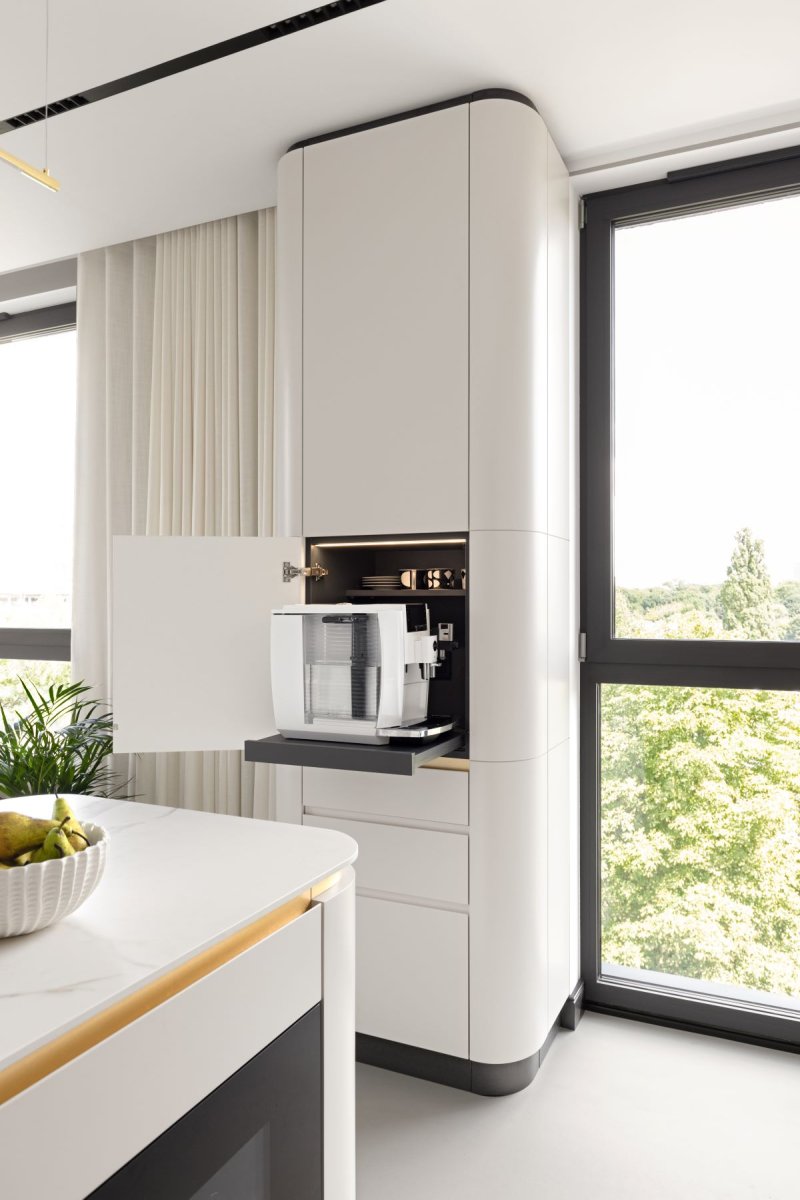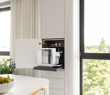 Czyli miejsce na Thermomix, ekspres do kawy czy blender. Ukryta wewnątrz szafki platforma, która jednym ruchem zamienia się w blat roboczy – szczególnie przydatna w kuchniach z ograniczoną przestrzenią.