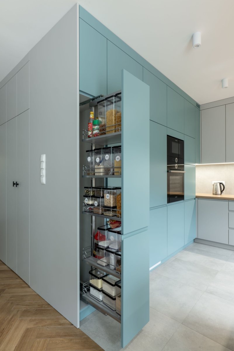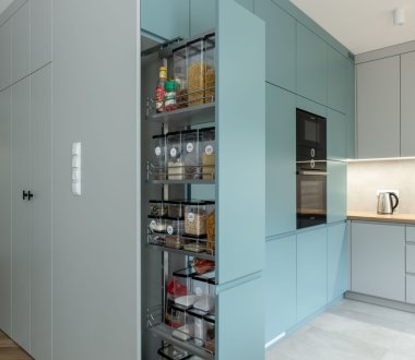 Ten majestatyczny słup wysuwanych szuflad marki Blum to marzenie każdego miłośnika porządku. Space Tower łączy design z wygodą – każda szuflada wysuwa się niezależnie, zapewniając dostęp do każdego produktu bez potrzeby przekładania zawartości. To idealne miejsce na suchą żywność, przetwory czy codzienne zapasy – wszystko na wyciągnięcie ręki, uporządkowane, intuicyjne, zachwycające.